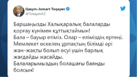 Мемлекет басшысы Қасым-Жомарт Тоқаев 1 маусым – Халықаралық балаларды қорғау күніне орай Twitter парақшасында құттықтау жариялады
