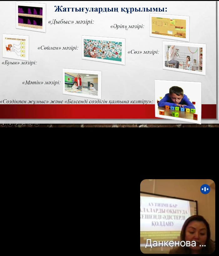 Жұмыс барысында Аутистік спектрі бұзылған балаларды психологиялық-педагогикалық қолдау жолдары, ҚР білім беру жүйесінде аутист балаларға көмек көрсету, «Аутистік спектры бұзылған балаларға қолдау көрсету жүйесін құру» жобасы бойынша жұмыстар, 6-8 жастағы аутистік спектры бұзылған балалардың тұрмыстық лексикасын дамыту бойынша тәжірибелік жұмыстары сияқты өзекті мәселелер бойынша баяндамалар тыңдалды. Қостанай облысынан «Аутизмі бар балаларды оқытуда кешенді əдістерді қолдану» тақырыбындағы баяндамасымен «Қостанай қаласы білім бөлімінің №17 жббм» ММ-нің педагог-зерттеуші, қазақ тілі мен әдебиеті пәнінің мұғалімі Данкенова Айгуль Хамзатқызы қатысты.Әріптесіміз баяндамасында аутизм диагнозы бар балаларды оқытуда кешенді түзете-оқытудың, заманауи əдістерді пайдаланудың тиімділігі туралы сөз қозғады.