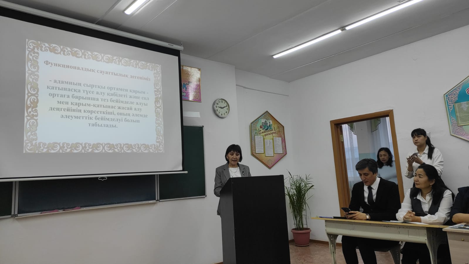 Р.М.Умарова ББЖМ аясында оқушылардың оқу сауаттылығын арттыру жолдарымен пікір бөлісті. Оқушылардың оқу сауаттылығын дамытуға әсер ететін факторларды айқындап көрсетті. ББЖМ аясында өткізілетін тестілеудің тақырыптары мен нақты оқу мақсаттарын талдады. Сонымен қатар спецификациясына назар аударды.