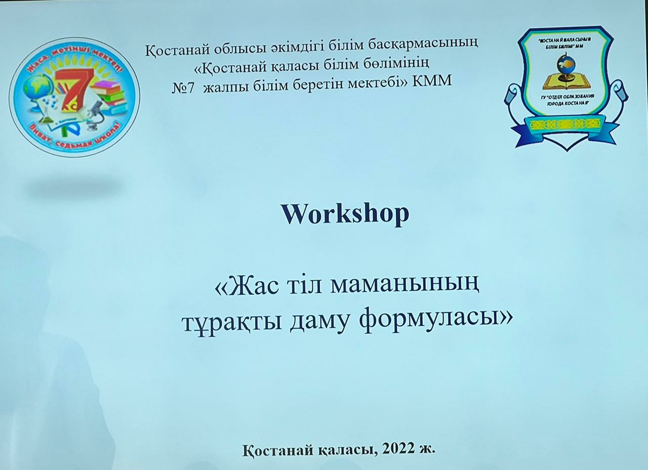 Қостанай қаласы білім бөлімінің жұмыс жоспарына сәйкес №7 жббм-нің базасында қазақ тілі мен әдебиеті пәні мұғалімдерінің " Жас тіл маманының тұрақты даму формуласы" тақырыбында жас мамандар арасында Workshop байқауы өтті.Байқаудың мақсаты: Жас тіл мамандарының кәсіби шеберлігін, инновациялық жұмыс тәжірибесін анықтау. Workshop барысында әрбір қатысушы өзінің әдістемелік идеясын ұсынды.Байқау барысында әрбір қатысушының ұсынған тақырыбы өз алдына өзекті әрі практикалық тұрғыдан нәтижелі болды. Workshop материалы "Шеберлік палитрасы -2022" кітапшасында білім бөлімінің сайтында жарияланады.Байқау қорытындысы :