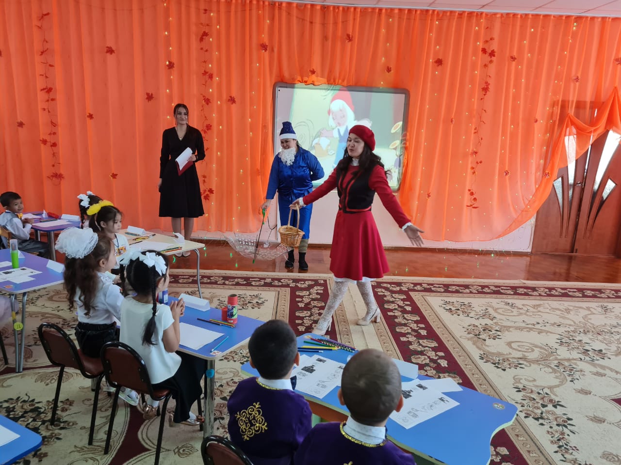 Бүлдіршіндер сүйікті кейіпкерлерімен бірге «Біз қандай ертегіденбіз?», « Мақал-мәтелдерді жалғастыр », «Жақсылық пен жамандық», «Дұрыс жауабын таңда», «Ертегілер еліндегі мейірімділік» және т.б. әр түрлі тапсырмаларды үлкен қуанышпен орындады.