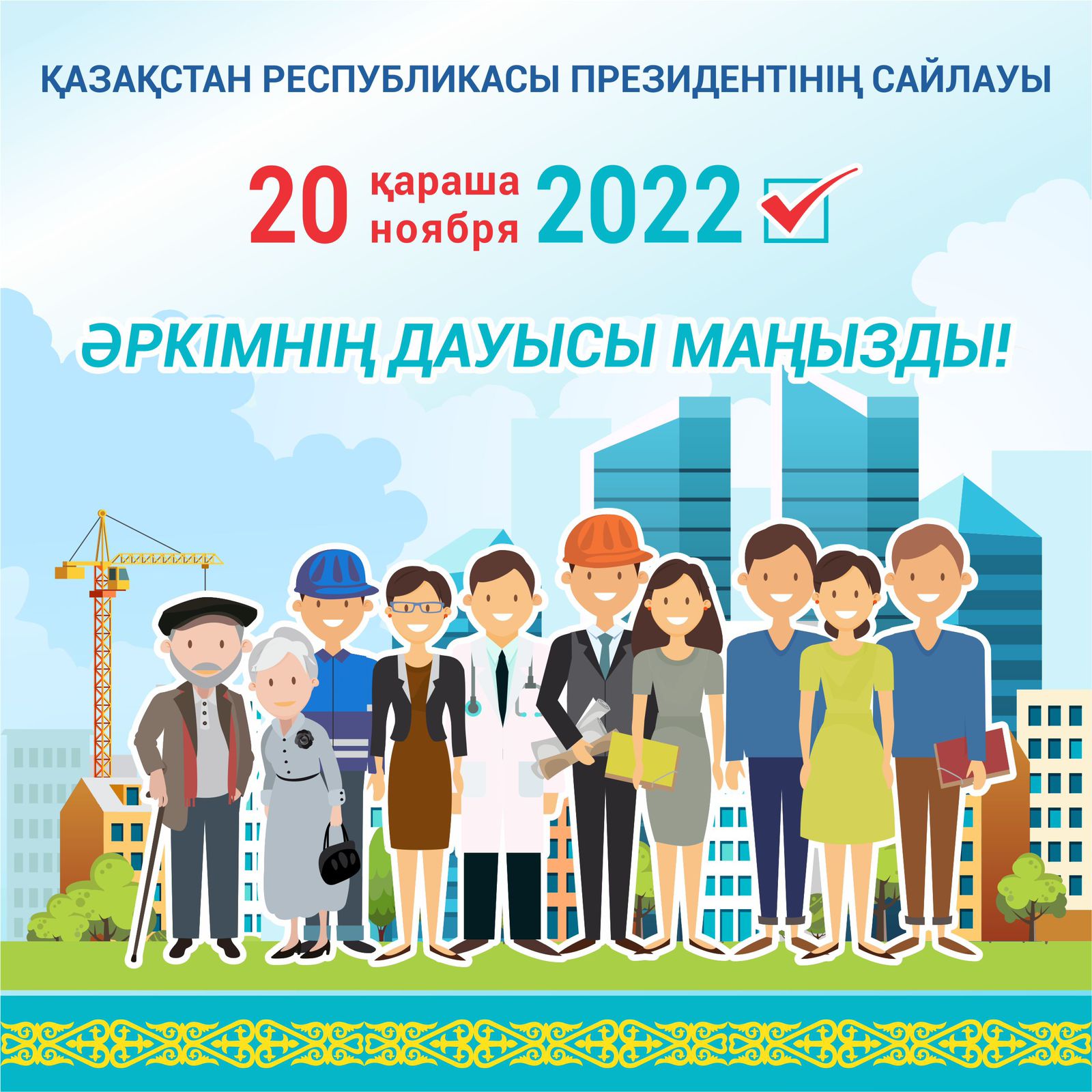 20 қарашада Біз еліміздің Президентін таңдаймыз. Бұл біздің мемлекетіміздің тарихындағы маңызды күн, өйткені біз әрбір қазақстандық отбасының өркендеуіне ұмтылатын жолды таңдаймыз. Сайлаушы болу-бұл конституциялық құқық және біз бұл құқықты пайдаланамыз. Біз тұрақтылық, жастардың кепілдігі, болашақ ұрпақтың әл-ауқаты үшін дауыс береміз. Президент сайлауына келіп, өз дауысыңызды беріңіз!