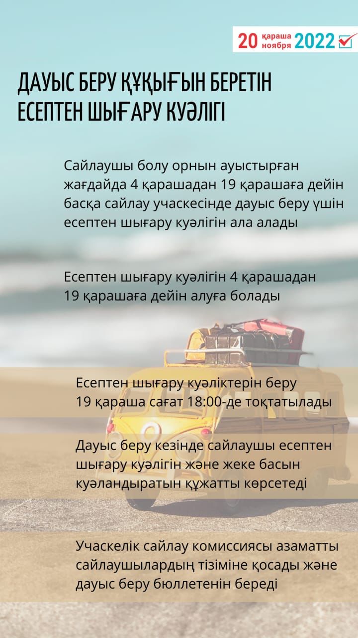 Если в день выборов Президента Республики Казахстан гражданин не имеет возможности проголосовать на своем избирательном участке, в связи с отъездом, ему предоставляется возможность проголосовать на избирательном участке по месту фактического нахождения. Важно лишь иметь при себе открепительное удостоверение, которое можно получить на участке по месту прикрепления в период с 4 по 19 ноября.