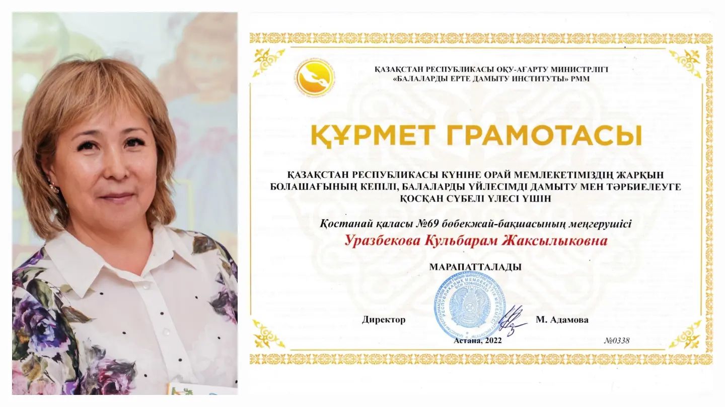 Почетной грамотой награждена заведующая КГКП Ясли-сад 69 отдела образования города Костаная Управления образования акимата Костанайской области Уразбекова Кульбарам Жаксылыковна от РГУ "Институт раннего развития детей" Министерства образования Республики Казахстан за вклад в развитие дошкольного образования.