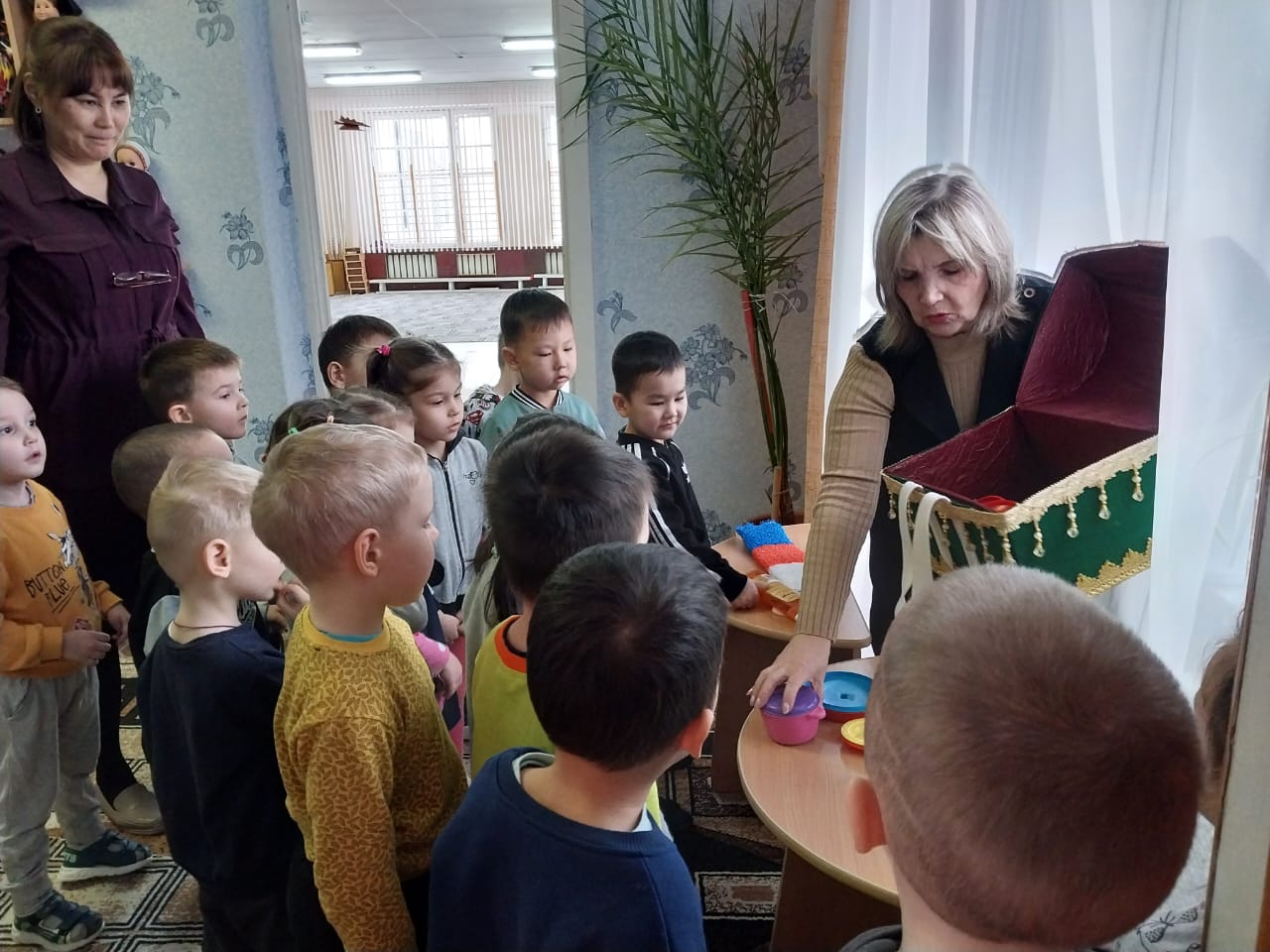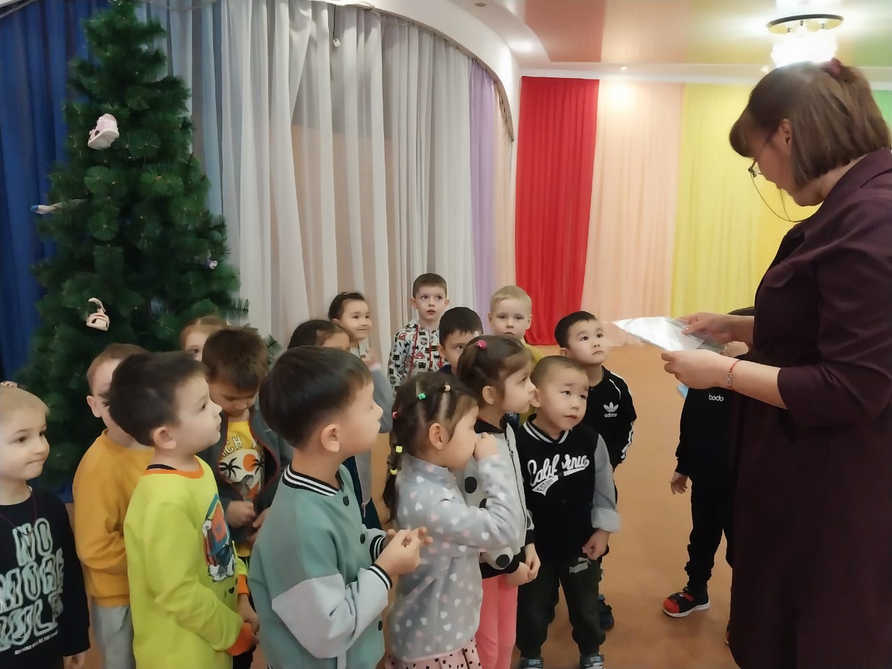 Герои сказок, попросили помощи у детей. Ребята отправились в Сказочную страну на ковре - самолете. Найдя карту и преодолев препятствия, дети нашли все предметы, спрятанные в сундуках, тем самым помогли героям сказок Алдар Косе , Ер- Тостику, Айболиту, Федоре и др. Ребята отлично справились со всеми испытаниями.