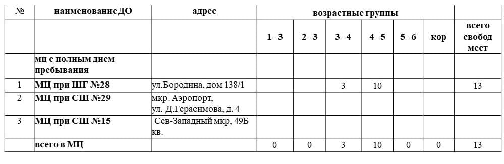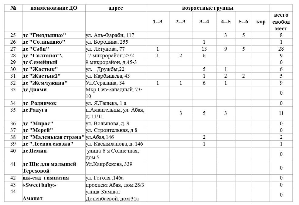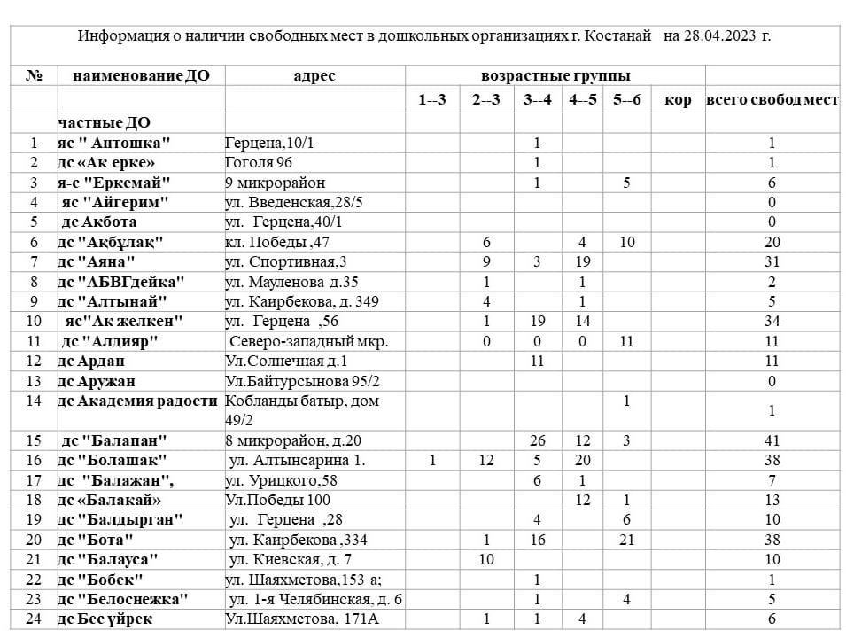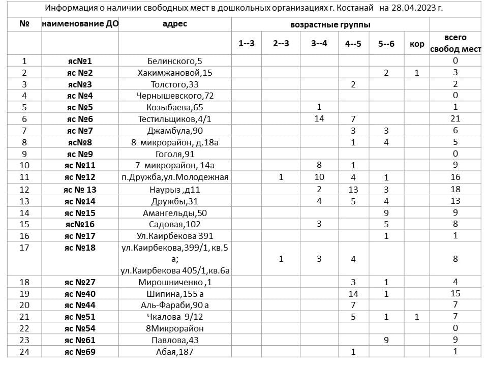 Уважаемые родители! На сегодняшний день в дошкольных организациях г.Костаная имеются свободные места, в том числе 163 места в государственных ясли- садах, 372 места с государственным общеобразовательным заказом в частных садах и 13 мест в мини-центрах с полным днём пребывания при общеобразовательных школах. Ниже предоставляем данные о свободных местах в разрезе садов и возрастной периодизации.