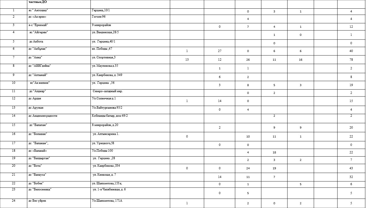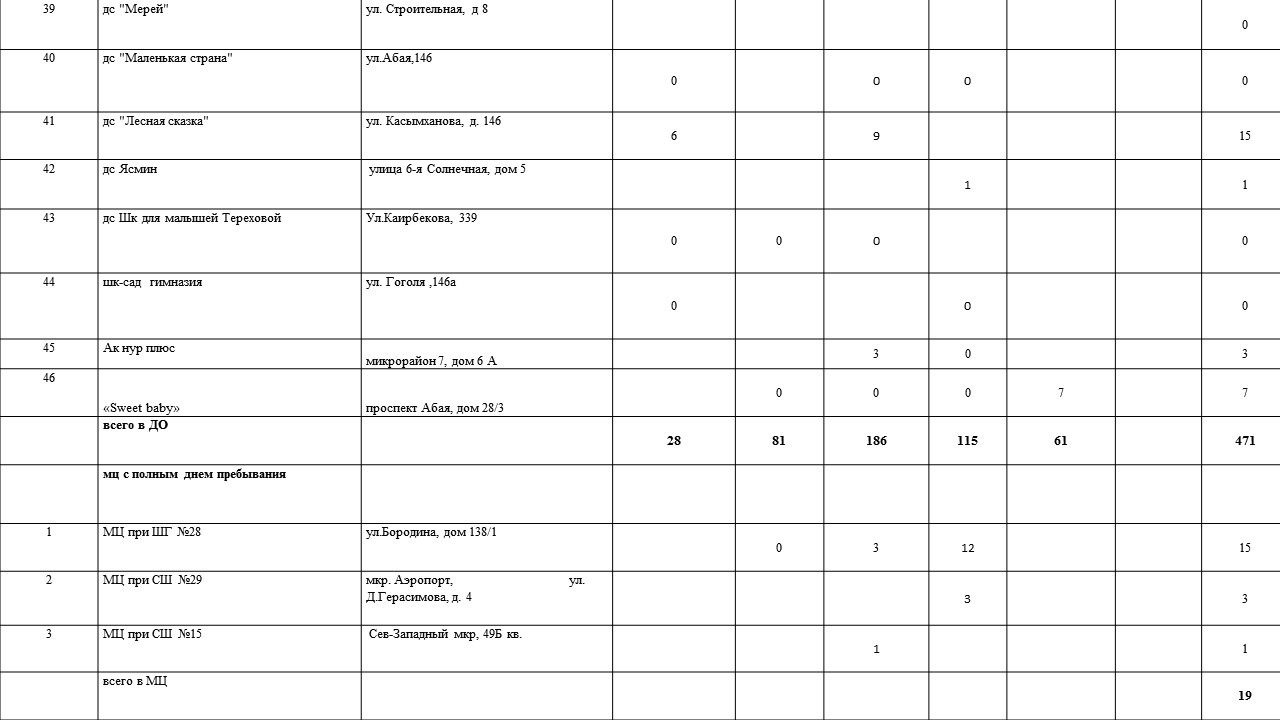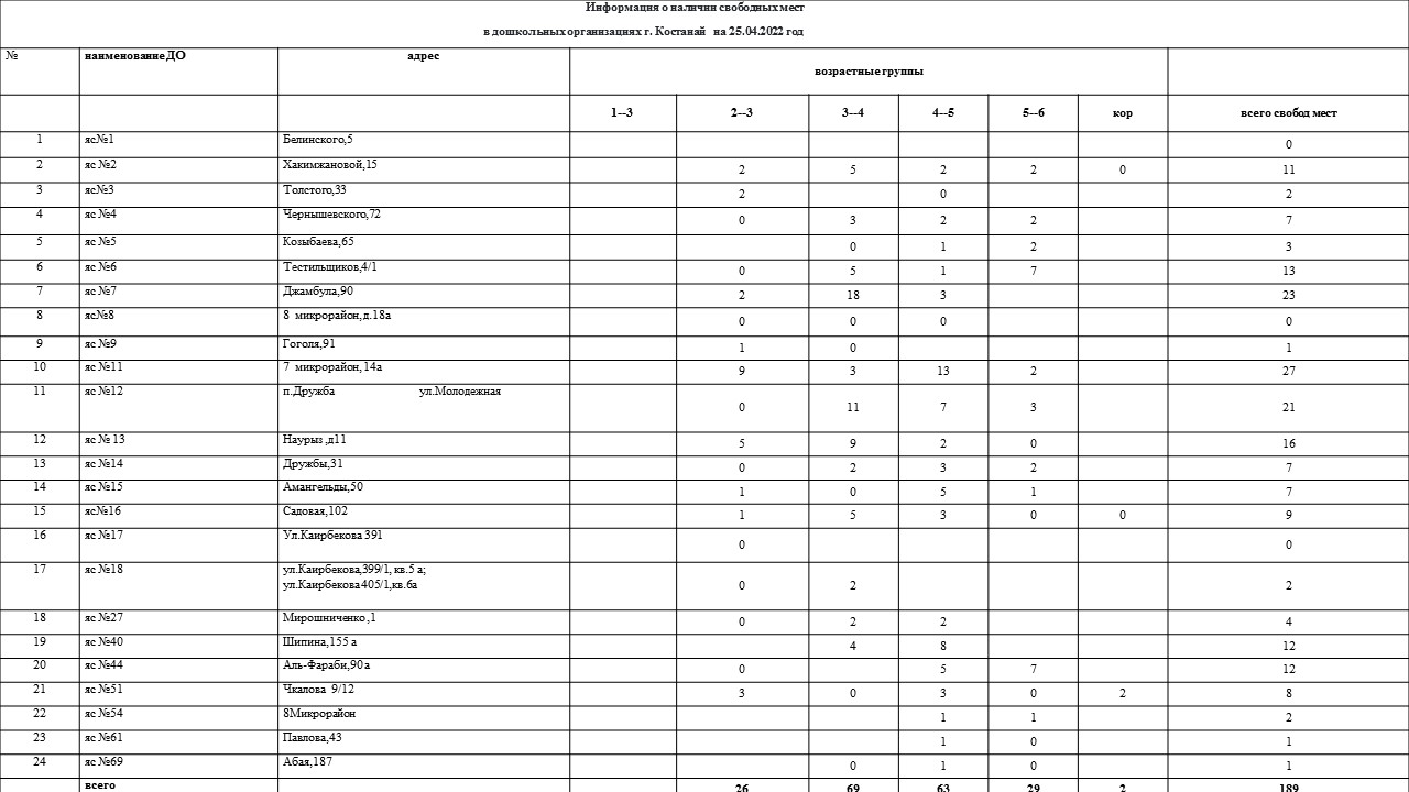 На сегодняшний день в дошкольных организациях г.Костаная имеются свободные места, в том числе 189 мест в государственных ясли- садах, 471 место с государственным общеобразовательным заказом в частных садах и 19 мест в мини-центрах с полным днём пребывания при общеобразовательных школах. Ниже предоставляем данные о свободных местах в разрезе садов и возрастной периодизации.